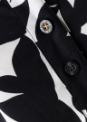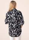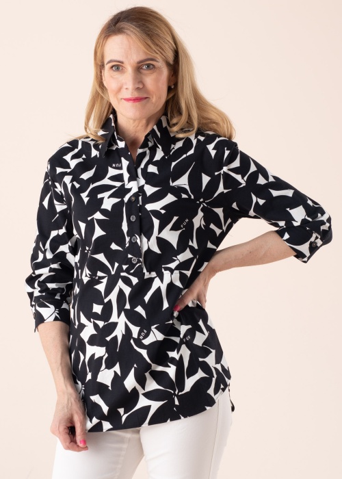 Platesnio kirpimo palaidinė pasiūta iš minkšto ir švelnaus audinio. Priekyje ji segama nedidelėmis sagutėmis, o marškinių stiliaus apykaklė suteikia rūbui oficialumo. 3/4 ilgio rankovių rankogaliai taip pat užsegami sagomis. Palaidinės audinys yra elastingas, todėl užtikrina patogumą net aktyviau judant. Modelis yra 178 cm ūgio ir dėvi 36 dydį. Sudėtis: medvilnė 97 %, elastanas 3 %. Spalva: juoda / balta.