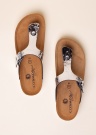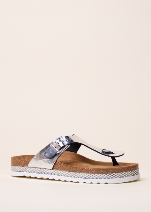 Tikrai patogūs batai moterims su sintetiniu ir sidabriškai blizgančiu paviršiumi. Diržą galima priderinti prie kojos, naudojant sagtį ant sandalo išorinio krašto. . Padas pagamintas iš sintetinės ir lengvos medžiagos. Pado aukštis 2 cm. 39 dydžio basutės dydis yra 245 g. Spalva: sidabrinė.