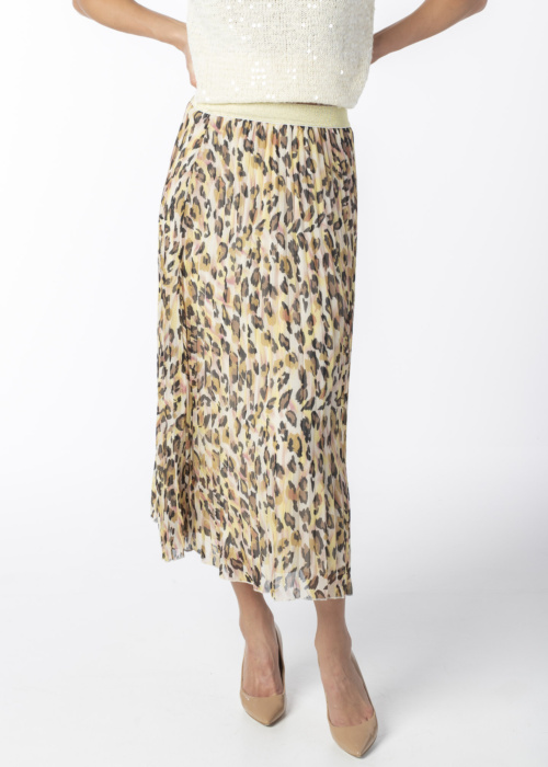 EsQualo moteriškas sijonas yra tikras stiliaus perlas, kuris išsiskiria įspūdingu ir įdomiu raštu. Šis plisuotas sijonas spinduliuoja elegancija ir žaižaruoja kiekviename žingsnyje, pritraukdamas aplinkinių dėmesį. Modelio ūgis yra 176 cm ir ji dėvi 36 dydį.