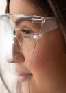 Veido apsauginiai akiniai yra tinkami nešioti viešose vietose. Peršviečiama plastikinė medžiaga yra tvirta ir patvari, ją lengvai galima uždėti ant veido su patogiomis akinių kojelėmis, o nosies atrama padeda išlaikyti tinkamą aukštį. Apsauginiai akiniai dengia beveik visą veidą. Tinka tiek vyrams, tiek moterims. Atstumas tarp akinių kojelių yra 15,5 cm. Spalva: skaidri.