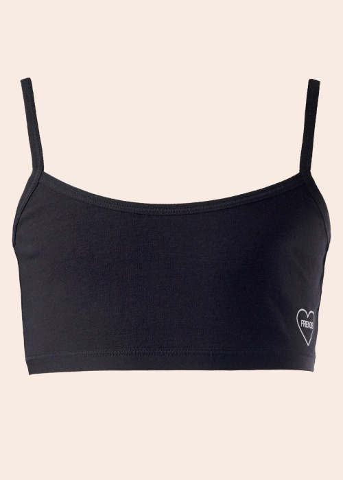 Stilinga, patogi FRIENDS liemenėlė su petnešėlėmis, pagaminta iš minkštos, švelnios medvilnės. Apatinis kraštas pervertas guma, o kairę pusę dekoruoja širdies formos logotipas. Medžiaga: medvilnė 95%, elastanas 5%. Spalva: juoda