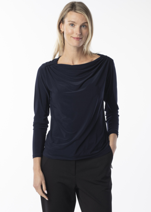 Hansmark moteriška palaidinė Bobi yra erdvi ir elegantiška, puikiai tinkanti įvairioms progoms. Ši palaidinė su ilgomis rankovėmis yra stilinga ir tampri, todėl užtikrina patogumą visą dieną. Blizgus audinys ir kengūros kišenė suteikia išskirtinumo. Modelio ūgis yra 177 cm, ir ji dėvi 38 dydį.
