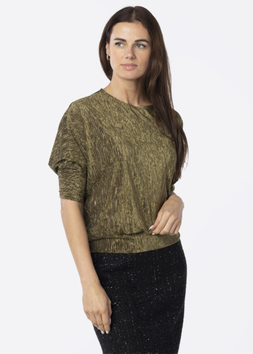 Kairi Vilderson moteriška palaidinė yra puikus pasirinkimas šventiniam įvaizdžiui, kuris tikrai patrauks aplinkinių dėmesį. Ši palaidinė išsiskiria dryžuotu raštu, šikšnosparnio tipo rankovėmis ir elastinga medžiaga, suteikiančia patogumo bei įdomumo. Peršviečiamas žaižaravimas prideda papildomo žavesio. Modelio ūgis yra 176 cm, ir ji dėvi 38 dydį.