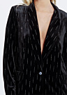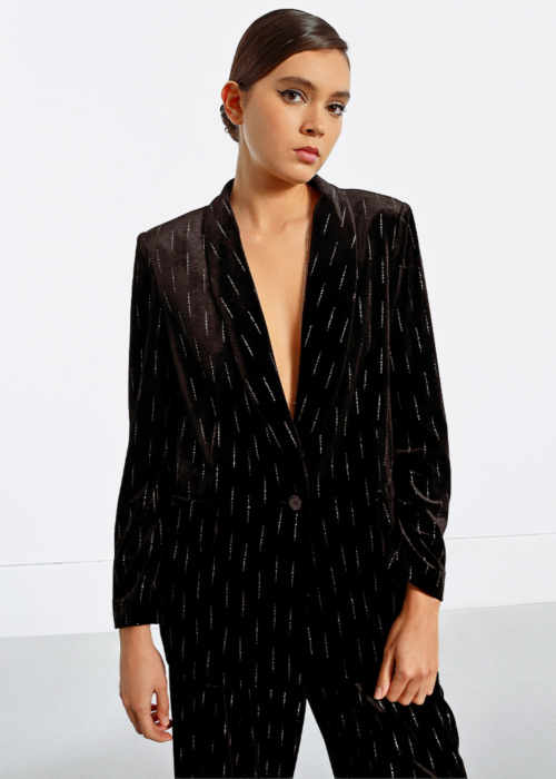 Lili Sidonio moteriškas švarkas yra tikras stiliaus ir elegancijos pavyzdys, puikiai tinkantis ypatingoms progoms. Šis aksominis švarkas su atlapo apykakle suteikia prabangos pojūtį, o sagomis užsegamas dizainas užtikrina patogumą ir stilingumą. Kišenės su atvartu ir blizgantis blizgutis papildo švarko išvaizdą, suteikdami jam išskirtinumo ir žavesio.