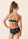 Ryškus „Zoe“ bikinis mergaitėms su aukso spalvos petnešėlėmis ir jūros motyvais. Jo kraštai taip pat apdoroti aukso spalvos apvadine juostele. Petnešėlės nugaroje susikryžiuoja, o kelnaitės dekoruotos smulkiais raukiniais. Maudymosi kostiumėlio audinys yra minkštas bei švelnus odai. Modelis yra 114 cm ūgio ir vilki 110 dydį.