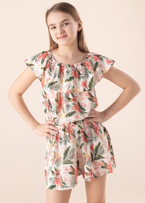 Su šiuo „Name It Vinaya“ kombinezonu džiaugsmingai pasitiksite šiltą vasarą! Gražus tropinis drabužio raštas akimirksniu sukuria jausmą, kad laikas mėgautis atostogomis ir neribota vasaros laisve! Iš lengvo audinio pasiūtas kostiumėlis turi vasarišką laivelio formos iškirptę su raukinukais ir elastingą liemenį. Lengvas ir erdvus audinys patogus ir malonus dėvėti. Modelis yra 147 cm ūgio ir dėvi 146 dydį. Medžiaga: perdirbtas poliesteris 58%, poliesteris 40%, elastanas 2%. Spalva: auksinė / spalvota / raštuota