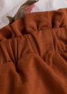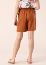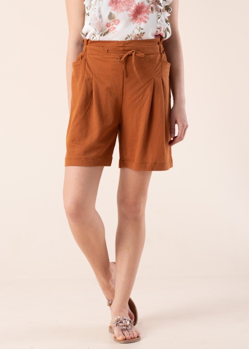 Iš lengvo audinio pasiūti šortai, kurie ties liemeniu rišami raišteliais, nugaroje turi tamprią gumą, dėl kurios patogiai priglunda prie kūno. Priekyje yra atviros kišenės. Erdvius ir lengvus šortus itin patogu dėvėti. Modelio ūgis yra 170 cm, ji vilki S dydį. Medžiaga: licencijuota viskozė 55%, poliamidas 45%. Spalva: ruda.