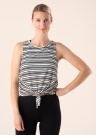 Vasariški, dryžuoto rašto „Only" marškinėliai „Amel“. Gyvybingumo ir žavesio suteikia galimybė priekyje juos surišti. Audinys yra plonesnis, todėl užtikrina gerą laidumą orui net ir aktyviau judant. Modelis yra 177 cm ūgio ir dėvi S dydį. Medžiaga: poliesteris 50%, viskozė 50%. Spalva: juoda / balta / dryžuota.