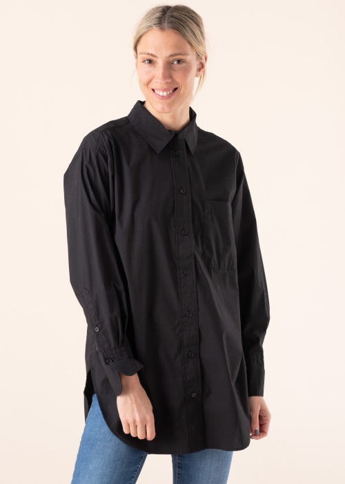 „Tom Tailor“ palaidinė yra geras pasirinkimas klasikinį stilių mėgstančioms merginoms. Stilinga palaidinė yra ilgesnė ir laisvesnio silueto, o dėl elastingos medžiagos ją ypač patogu dėvėti. Priekyje rūbas segamas sagomis, turi atvirą kišenę ant krūtinės, o šonuose – gilesnius ir suapvalintus skeltukus. Modelis yra 177 cm ūgio ir dėvi S dydžio palaidinę.