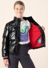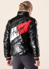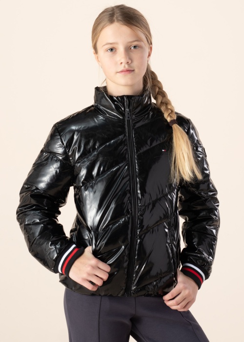 Dygsniuota Tommy Hilfiger žieminė striukė yra šiek tiek platesnio kirpimo ir yra išskirtinio blizgesio. Užsegama užtrauktuku priekyje, turi aukštesnę apykaklę, kuri apsaugo kaklą nuo vėjo bei užsegamas kišenes. Striukę puošia didelis prekės ženklo logotipas nugaroje ir keli minimalistiniai priekyje. Rankovių galai apsiūti tampria medžiaga, kuri maloniai priglunda prie riešų. Vidus yra padengtas minkštu audiniu, kuris užtikrina komfortą nugarai. Modelis yra 153 cm ūgio ir vilki 152 dydį. Bendras striukės ilgis - 54 cm. Medžiaga: poliesteris 100%, užpildas - poliesterio pluoštas 100%. Spalva: blizgi juoda.
