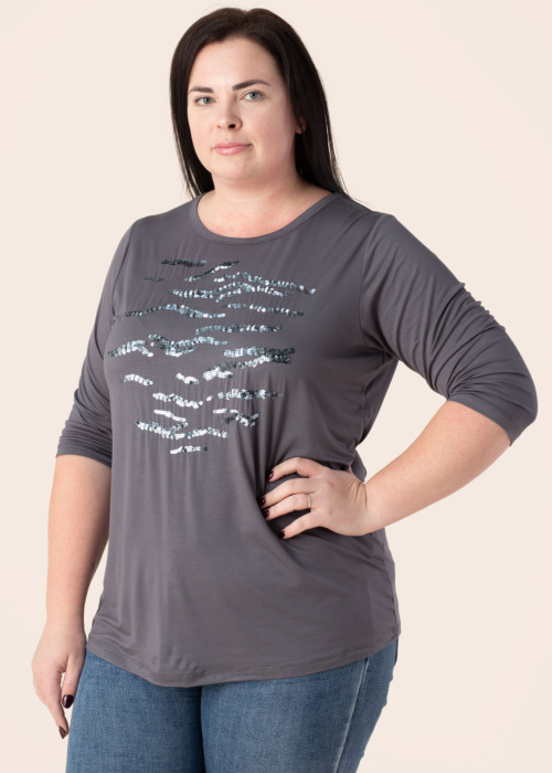 Wasabiconcept moteriška palaidinė Sibille yra elegantiškas ir patogus pasirinkimas kasdieniam dėvėjimui. Ši palaidinė turi rankoves, kurios siekia alkūnes, apvalią iškirptę ir yra pagaminta iš tamprios, maloniai prie kūno priglundančios medžiagos. Ji gerai krenta ir turi švelnų blizgesį. Modelio ūgis yra 167 cm, ir ji dėvi 46-48 dydžio drabužį.